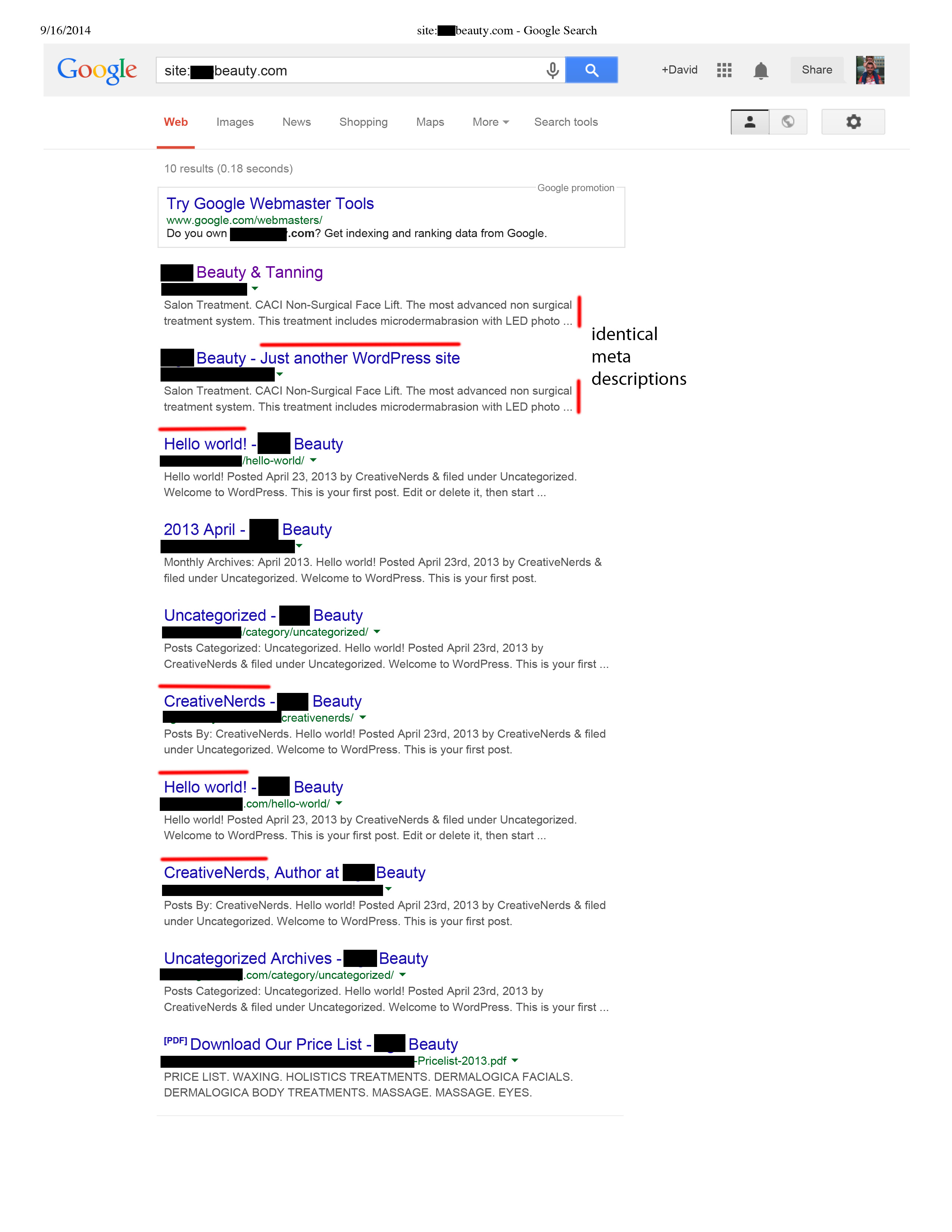 One on the websites we examined (and shall remain nameless) when we conducted a Google search using the site: command we found they only had 10 pages in the Google index; three pages still had the standard WordPress titles such as ‘Hello World’ and ‘Just Another WordPress Site’. Two of the pages were titled with the name of the company that built the website, so less than helpful to their target audience. When we examined the website from the web.archive we found that the site had been like this for many years, so it wasn’t the case that a website redesign was in progress.